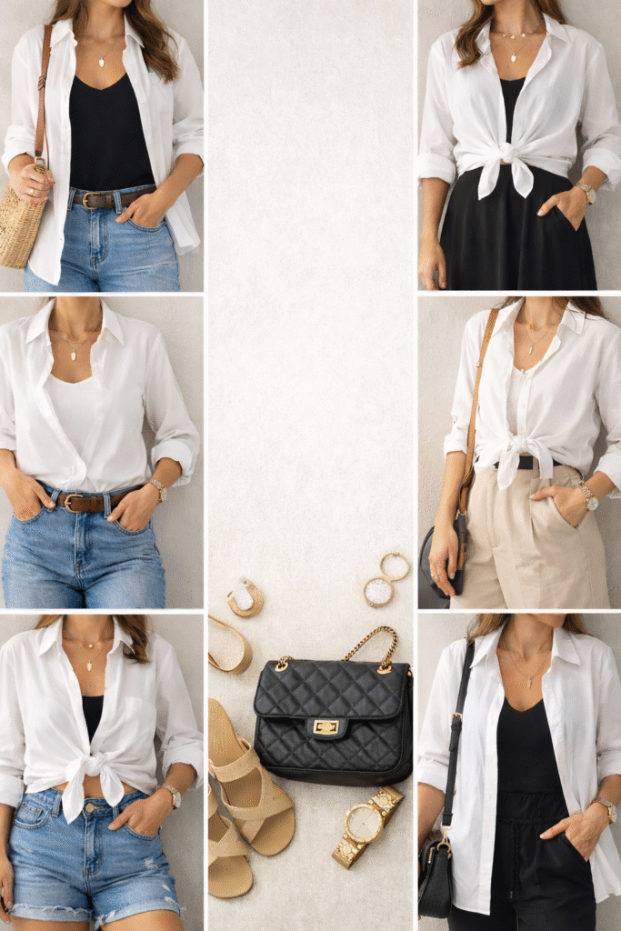 O grande diferencial não está em ter várias camisas, mas em saber usá-la de formas diferentes: aberta como terceira peça, por dentro com cinto, com nó para criar cintura ou combinada com tecidos mais leves. Esses detalhes mudam completamente a leitura do visual — sem exigir novas compras.