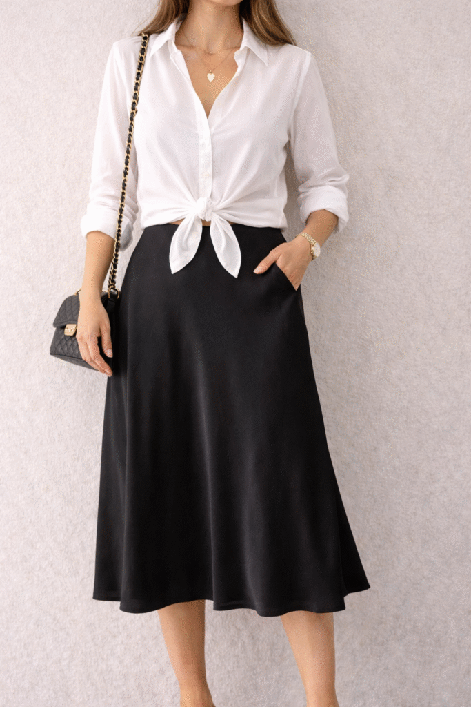 Noite leve: camisa com nó + saia midi (ou calça leve)