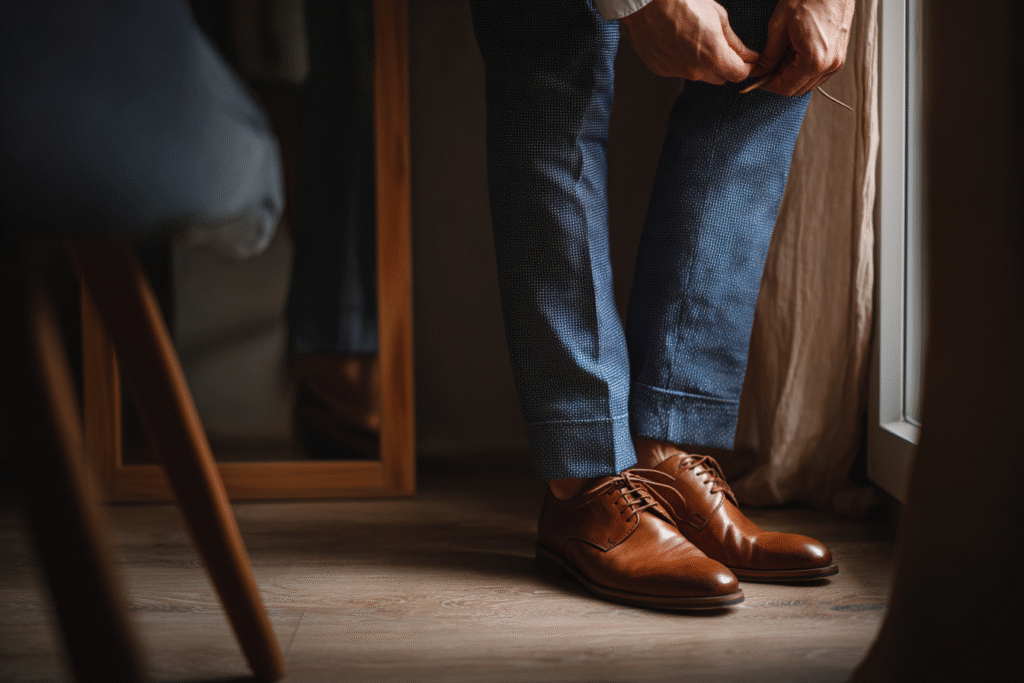 Observe se o tecido quebra levemente sobre o sapato, sem acumular. É uma das correções mais simples entre os 7 erros que envelhecem o homem e muda completamente a percepção de altura e postura.