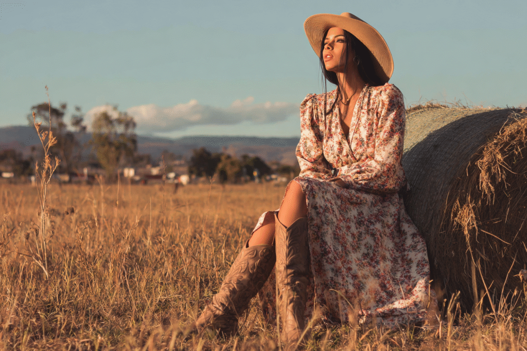 Os tecidos mais indicados são algodão, viscose e linho, que proporcionam frescor e movimento. Cores como terra, verde-oliva, vinho e bege reforçam a conexão com a natureza. O equilíbrio entre simplicidade e beleza é um dos pontos altos das 8 dicas de moda country feminina para arrasar com elegância no campo e na cidade.