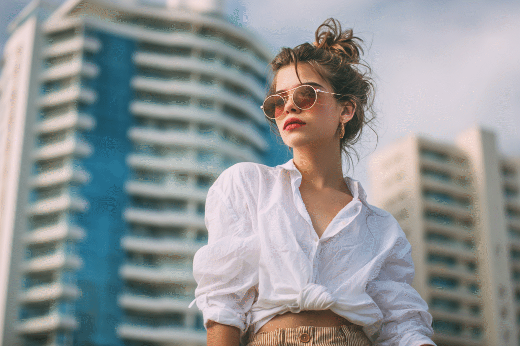 O nó frontal pode ser feito sobre vestidos, saias de cintura alta ou calças flare, criando um efeito visual que valoriza a silhueta. Já a camisa amarrada na cintura funciona como um acessório utilitário, especialmente em looks com vibe streetwear ou festival.