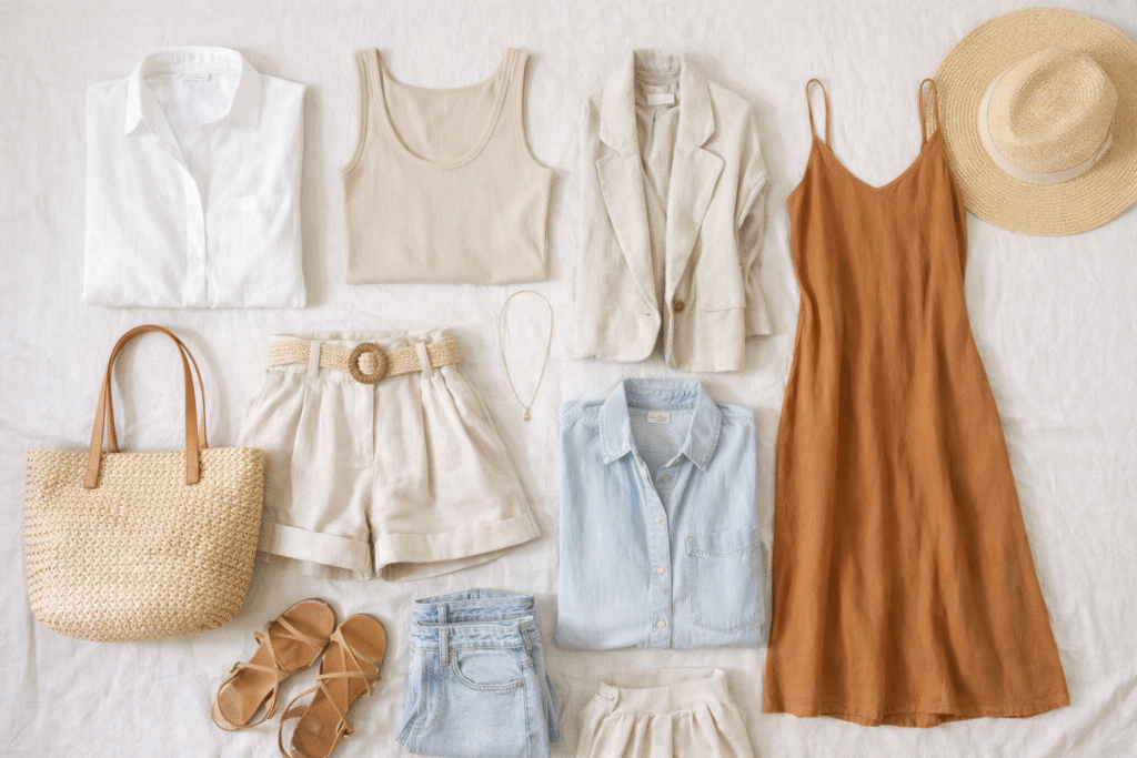 Seguindo Como montar um guarda-roupa cápsula para o verão: guia completo para um estilo leve e funcional, tecidos como linho, algodão, viscose e modal são ideais, pois garantem conforto térmico, leveza e respirabilidade.