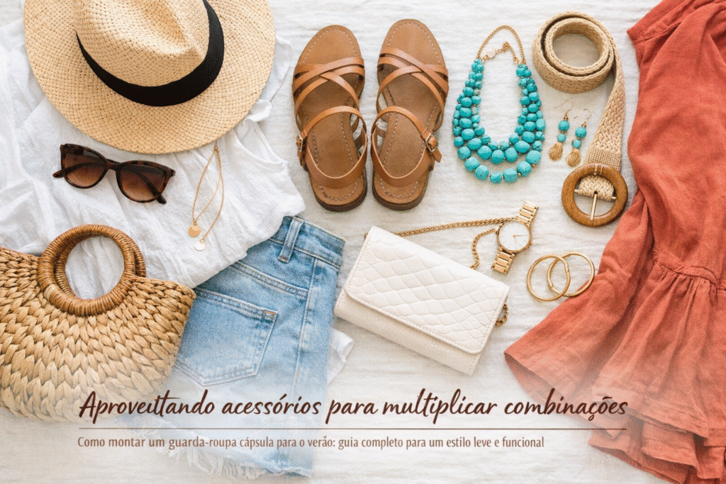 Dentro do conceito de Como montar um guarda-roupa cápsula para o verão: guia completo para um estilo leve e funcional, os acessórios desempenham papel estratégico. Eles permitem transformar um look básico em uma produção sofisticada sem a necessidade de muitas roupas. Bolsas, cintos, chapéus e óculos ajudam a acrescentar personalidade e identidade ao visual. Assim, o armário cápsula se torna ainda mais eficiente.