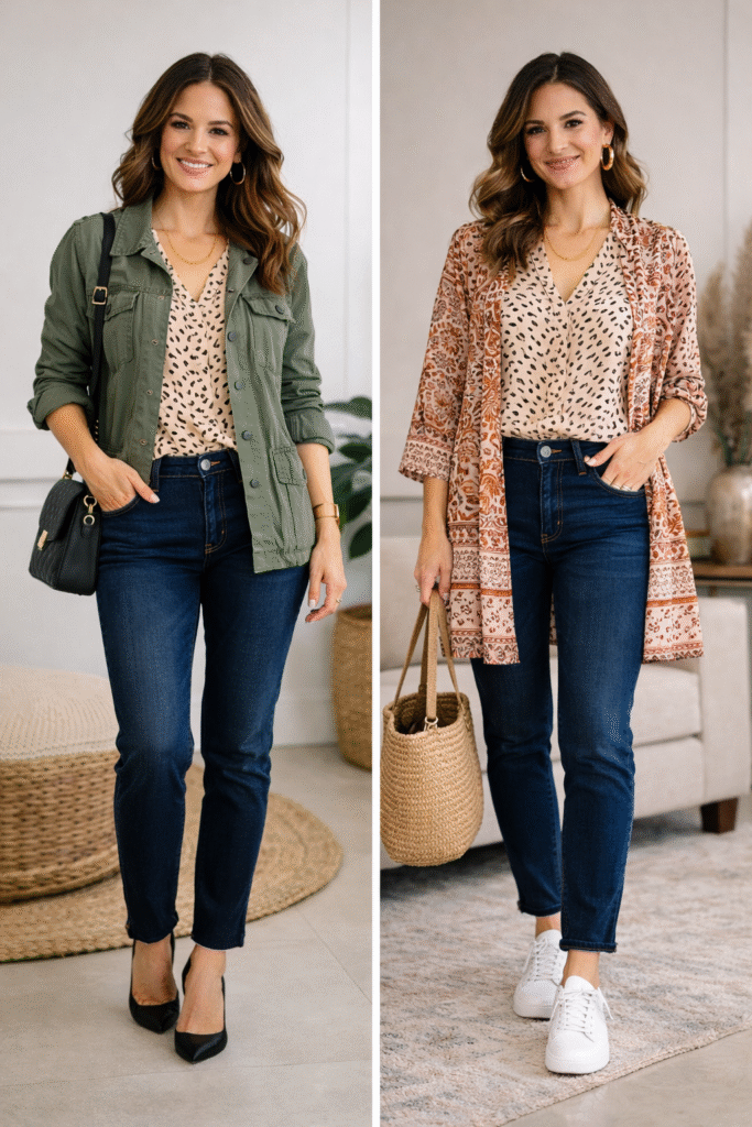 Por fim, a chamada terceira peça faz toda a diferença. Blazers, camisas abertas, coletes ou cardigãs transformam completamente um visual repetido. Esses recursos ajudam a construir looks variados, coerentes e elegantes, provando que estilo não está na quantidade de roupas, mas na forma como elas são usadas.