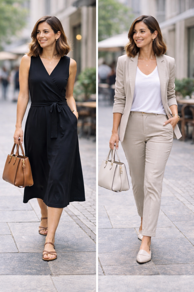 Um exemplo real: calça preta, camiseta branca e blazer. De dia, mule neutro. À noite, sandália de tiras e bolsa pequena. Esse tipo de combinação mostra claramente como se vestir melhor usando poucos elementos.